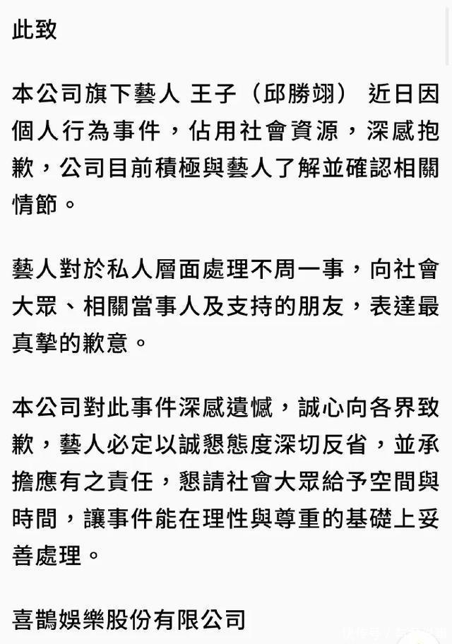 公司对此事件深感遗憾,诚心向各界致歉,并表示艺人必定以诚恳态度深切反省,并承担应有之责任。公司恳请社会大众给予空间与时间,让事件能在理性与尊重的基础上妥善处理。该声明由喜鹊娱乐股份有限公司发布,内容被多家媒体引用,作为公司对事件的正式立场。