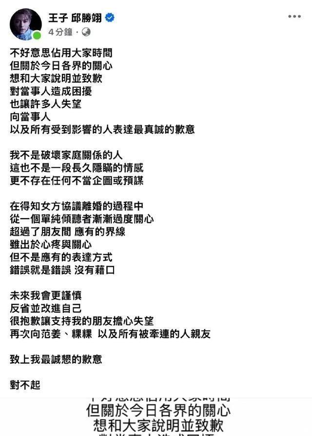 范姜彦丰进一步表示,通过调查获得明确证据,证实粿粿与王子邱胜翊之间存在婚外情,并在confrontation时粿粿否认出轨但承认与王子邱胜翊保持持续联系,甚至带孩子一同见面。范姜彦丰在长文中强调,其信任和真心被践踏,最终成为戴绿帽的小丑,这一表述迅速在网络上传播。 事件曝光后,相关话题如曝王子插足他人婚姻和王子发文道歉迅速登上热搜榜,引发大量讨论。范姜彦丰的视频和长文被多家媒体转载,包括红星新闻、潇湘晨报和扬子晚报,这些报道均基于范姜彦丰的社交平台内容进行描述,没有添加额外信息。 范姜彦丰作为演员,曾参与2014年广东卫视中国好男儿节目和2018年优酷这就是歌唱对唱季节目,其作品包括永远的第一名等,但事件焦点集中在婚姻纠纷上。粿粿江玮琳则在节目中曾表示自己不可能出轨,并提到与范姜彦丰同为狮子座,性格相近,这一旧内容在事件曝光后被网友翻出,与当前指控形成对比。 同日,王子邱胜翊通过个人社交平台发布回应声明,承认在事件中存在不当行为。他在声明中表示,向当事人以及所有受到影响的人表达最真诚的歉意,并强调自己不是破坏家庭关系的人,这也不是一段长久隐瞒的情感,更不存在任何不当企图或预谋。 王子邱胜翊解释,在得知女方处于协议离婚过程中时,自己从单纯的倾听者渐渐变得太过关心,从而超过朋友界线。他承认虽出于心疼与关心,但这不是应有的表达方式,并直言错误就是错误,没有借口。王子邱胜翊进一步表示,未来将更谨慎、反省并改进自己,向范姜彦丰、粿粿江玮琳及所有被牵连的人和亲友致歉。这一声明被视为对指控的直接回应,但未否认与粿粿江玮琳的互动越界事实。 王子邱胜翊的回应发布后,其所属经纪公司喜鹊娱乐于2025年10月29日下午发出官方声明。公司在声明中称,本公司旗下艺人王子邱胜翊近日因个人行为事件占用社会资源,深感抱歉,目前积极与艺人了解并确认相关情节。声明承认艺人对于私人层面处理不周一事,向社会大众、相关当事人及支持的朋友表达最真挚的歉意。